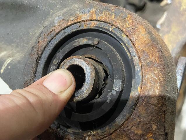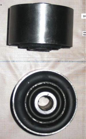 As you can see on the pictures : the transversal bushings. These ensure a good road-holding, and when replaced, a clearly better driving behaviour can be observed. Vibration free driving, and a better contact with the road. These suspension bushings have to be disassembled and mounted with a hydraulic press.
